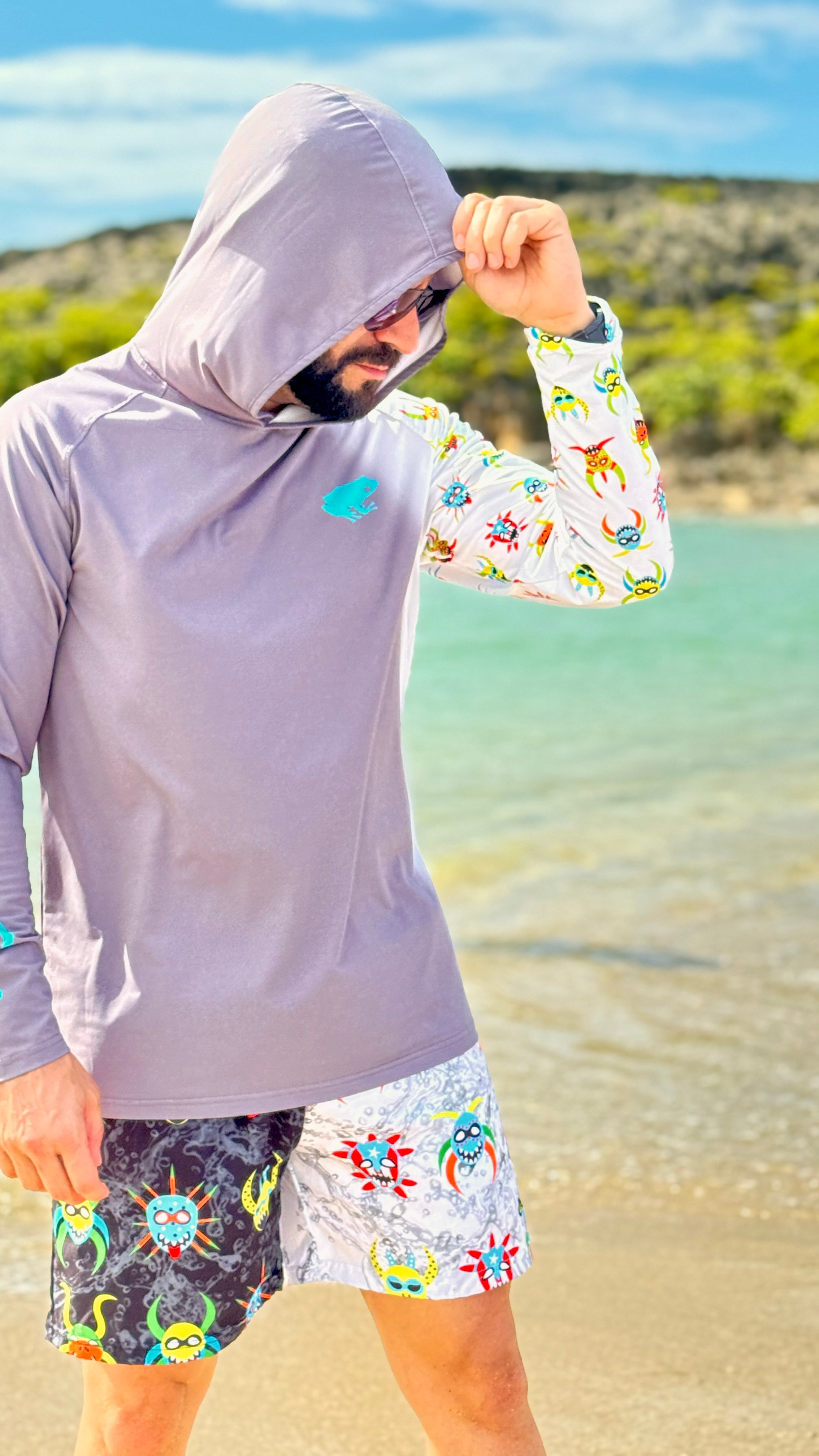 Stay protected with cultural power in this long-sleeve hooded rash guard, made with UPF 50+ quick-dry fabric. The gray body fades into a white left sleeve featuring a full-color Vejigante mask pattern — bold, traditional, and full of Puerto Rican energy. A blue coquí accents the chest, with the Cokí Clik logo printed on the right sleeve. Built for the beach, the surf, and the street. Get yours now and Join the Clik!